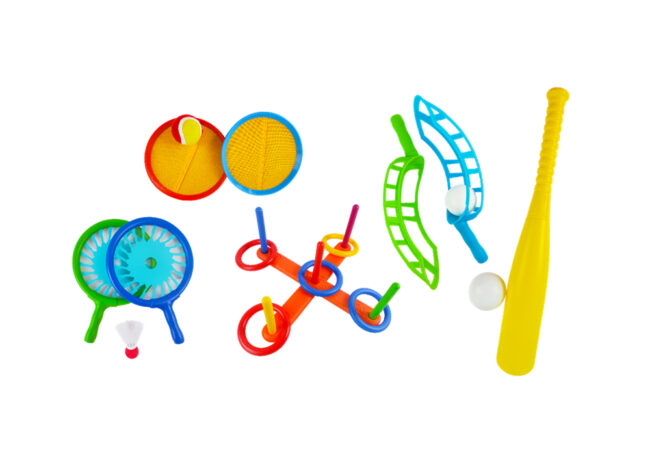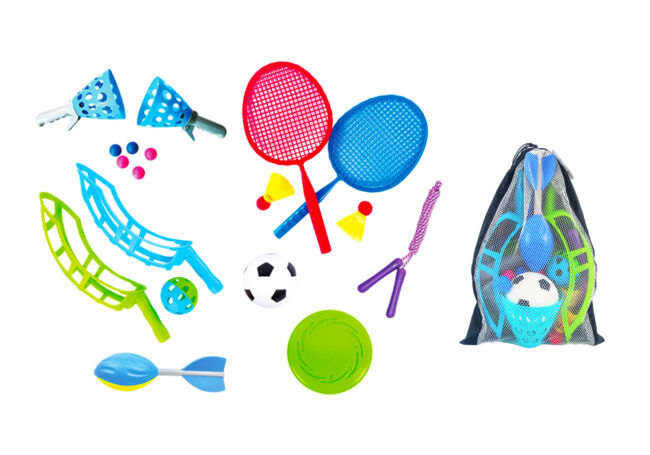 Include: Catch ball cup holder x 2, Plastic ball x 5Scoop Paddle x 2, Pickleball x 1Jump Rope x 1Foam Rocket x 1Badminton Bat x 2, Shuttlecock x 2Soccer x 1Flying Disc x 1Storage Bag x 1 Material: PU, EVA, PE, PP, HIPS, POM, PS, PVC Packaging: Hang Tag Package Size: 285 x 145 x 450…