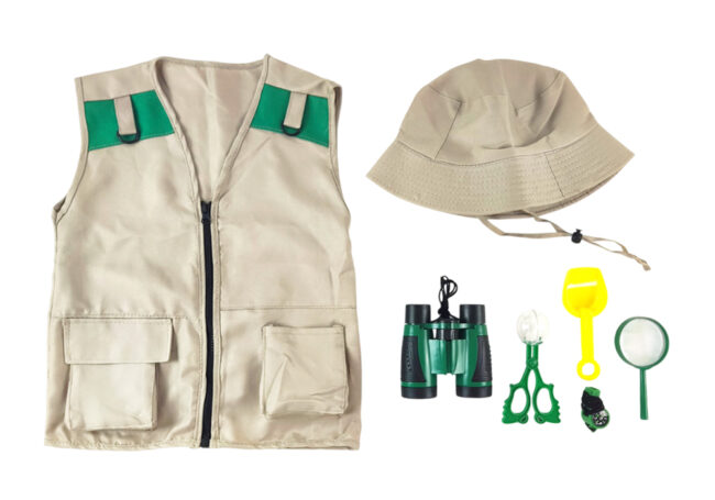 Include: Vest x 1Hat x 1Binoculars x 1Trap Clip x 1Magnifying glass x 1Whistle x 1Mini shovel x 1 Material: PP, PS, ABS, Polyester, Metal, PVC, PMMA Packaging: Printed Box Package Size: 248 x 60 x 168 mm 9.76 x 2.36 x 6.61 in