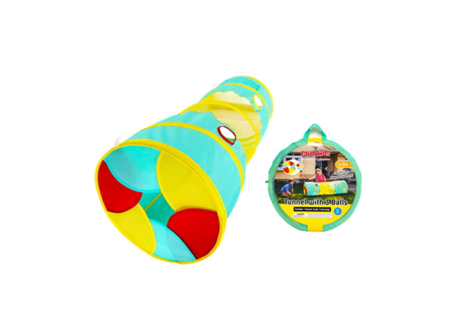 Include: Tunnel x 1Play ball x 3 Material: Polyester, Metal, PE, PP Item Desc: Tunnel: Ø450 x L1200 mm / 17.7 x 47.2 in Ball: Ø65 mm / 2.5 in Packaging: Storage Bag + Sleeve Card Selling Package Size: 500 x 65 x 550 mm 19.69 x 2.56 x 21.65 in Actual colors may vary.