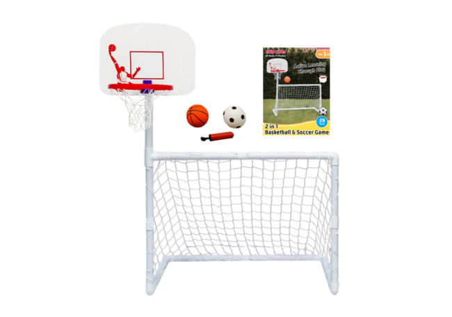 Include: Stand x 1 (Includes: Tube x 11, Connector x 10, Net x 1)Soccer Ball x 1 Basketball x 1 Pump x 1 Material: ABS, PP, Metal, Polyester, PVC Item Desc: Soccer Goal: 800 x 400 x 600 mm / 31.5 x 15.8 x 23.6 in Basketball Stand: 1140 mm / 44.9 inSoccer Ball: Ø125…